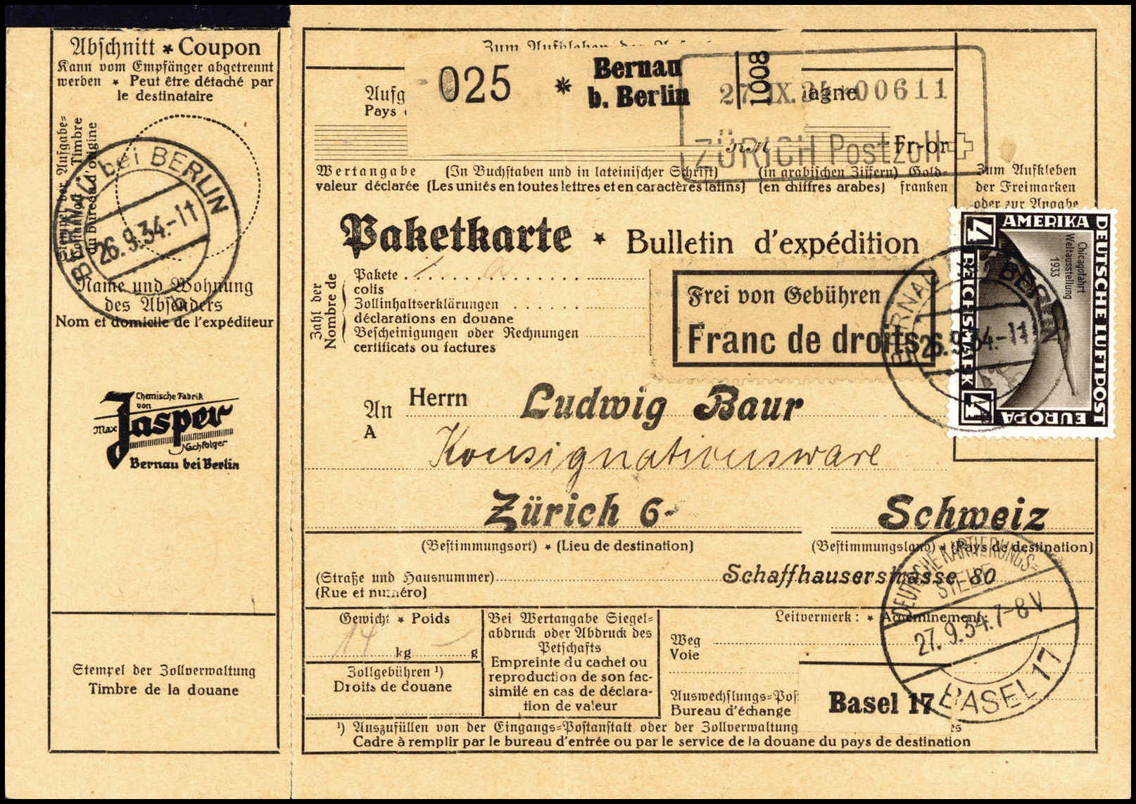 4 Mk., tadellose Einzelfrankatur mit klarem Stempel BERNAU BEI BERLIN 26/9 34 auf gef., teils vorgedruckter Auslands-Paketkarte in die Schweiz (Coupon oben min. verkürzt). sign. Peschl BPP. Katalogpreis: 800,-+