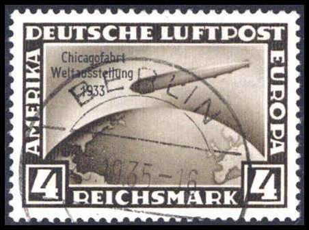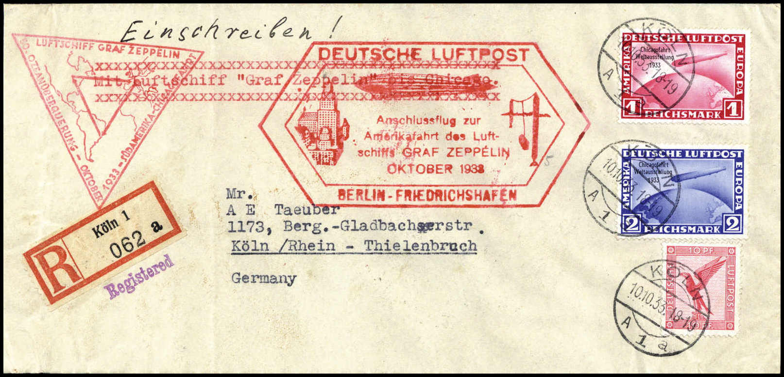Chicagofahrt, tadellose Serie auf zwei Einschreibe-Zeppelinbriefen mit Stempel KÖLN 10.10.33 und beiges. rotem Sonderbestätigungsstpl. für den Anschlussflug BERLIN-FRIEDRICHSHAFEN. Selten. Katalogpreis: 1.650,-+