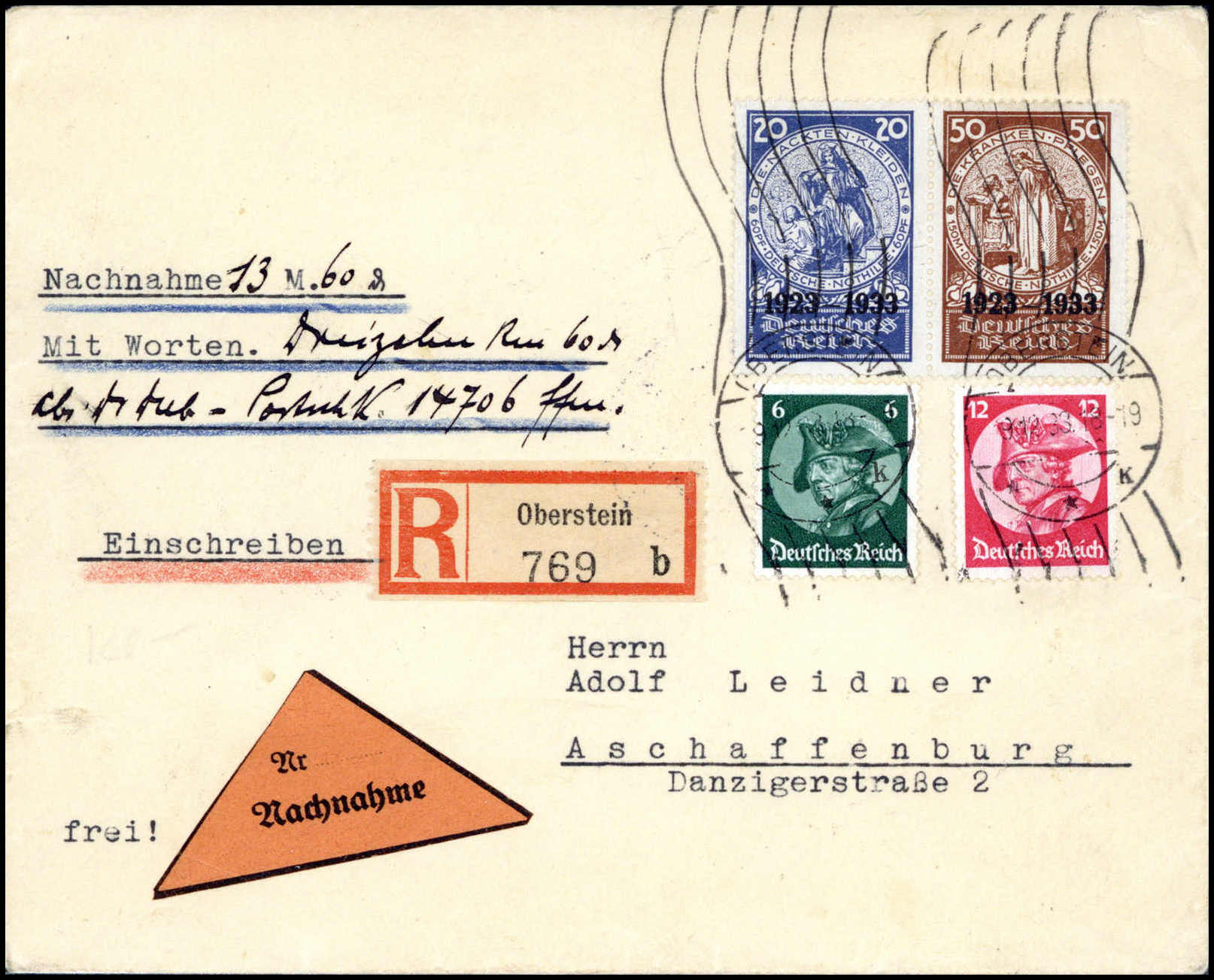 20 und 50 Pfg., Zusammendruck aus Nothilfe-Block mit Fridericus 6 und 12 Pfg. auf Nachnahme-Einschreibebrief von Berlin nach Aschaffenburg