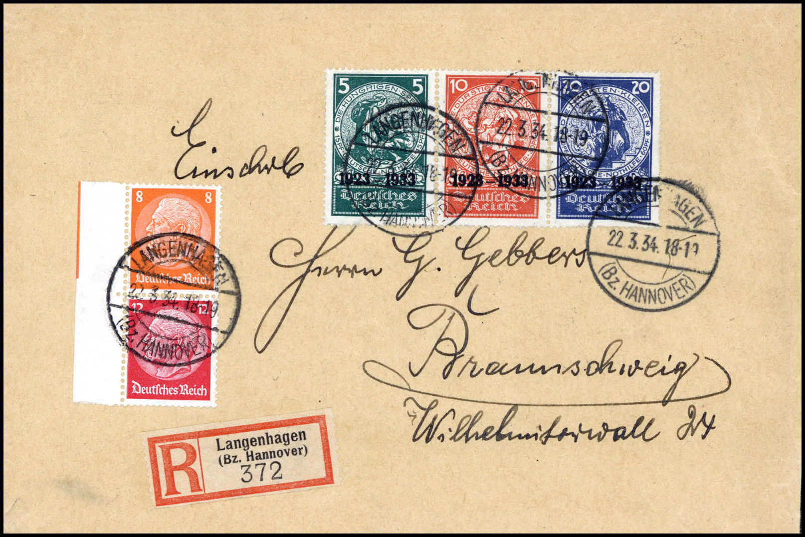 5, 10 und 20 Pfg., Zusammendruck auf Nothilfe-Block mit Hindenburg-Zusammendruck 8/12 Pfg. auf Einschreibebrief von Langenhagen nach Braunschweig