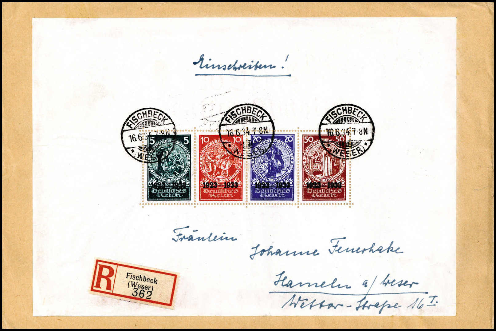 Nothilfe-Block, Einzelfrankatur auf philatelist. Einschreibebrief mit drei sauber aufges. Stempeln FISCHBECK 16/6 34 sowie Adressangabe auf dem Blockrand nach Hameln mit Eingangsstpl. Einer der qualitativ besten Briefe mit einem