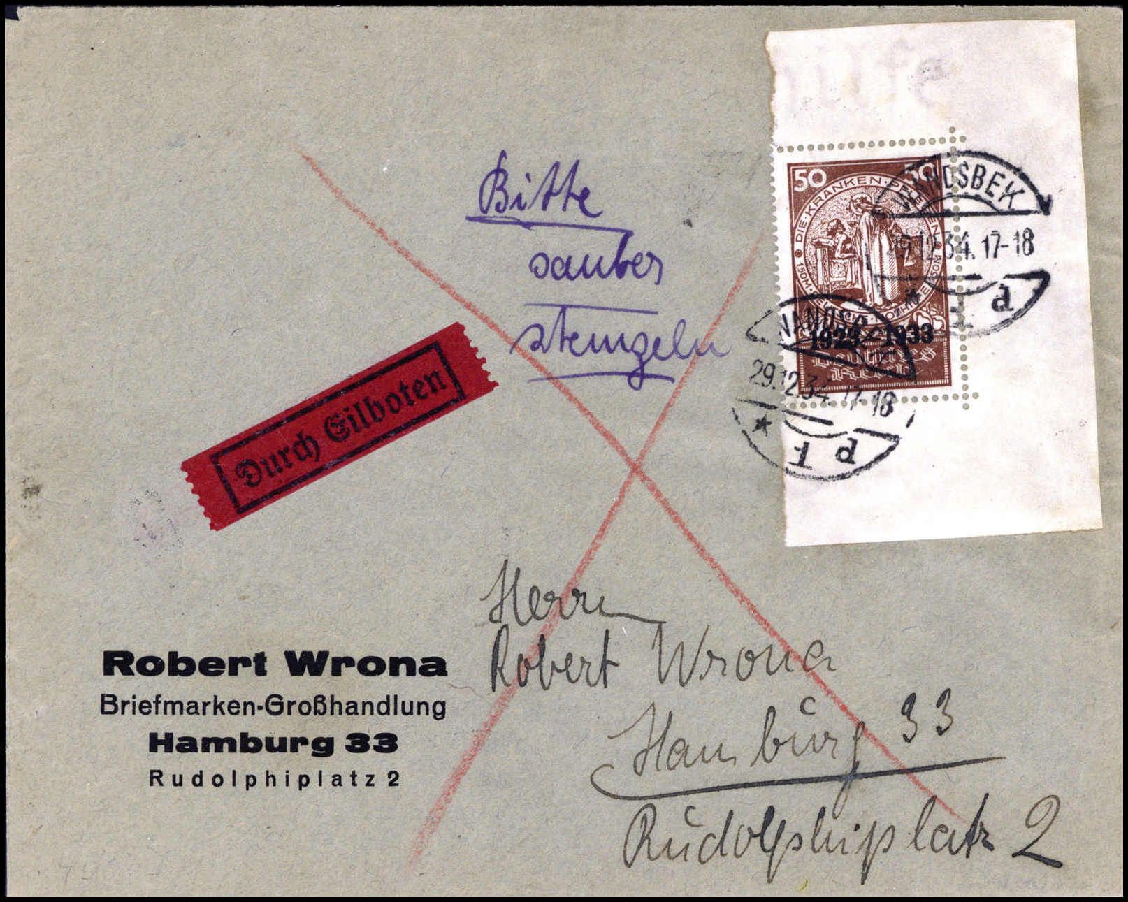 50 Pfg. aus Nothilfe-Block, EF auf Eilbotenbrief von Wandsbek nach Hamburg mit Ak.-Stempel. Katalogpreis: 800,-
