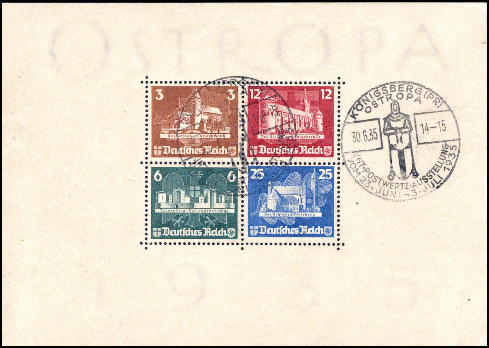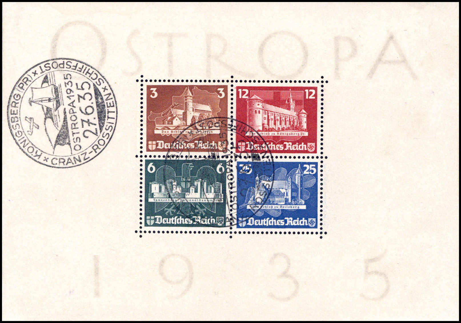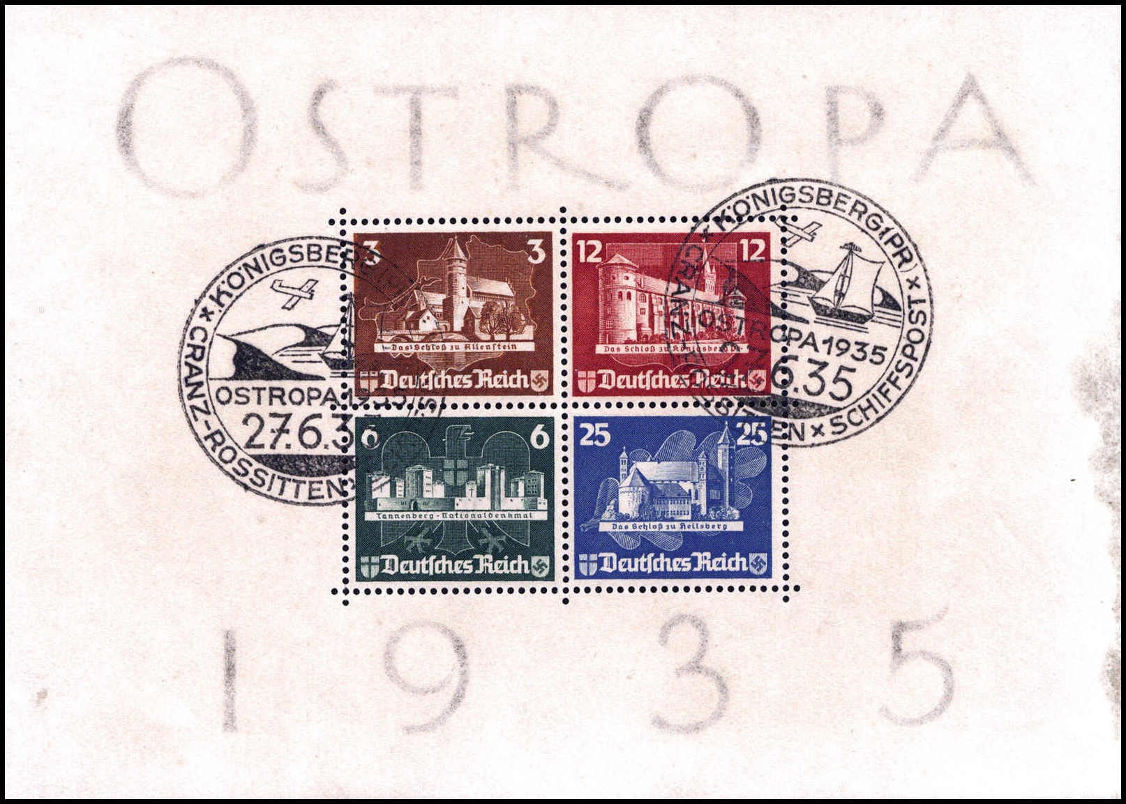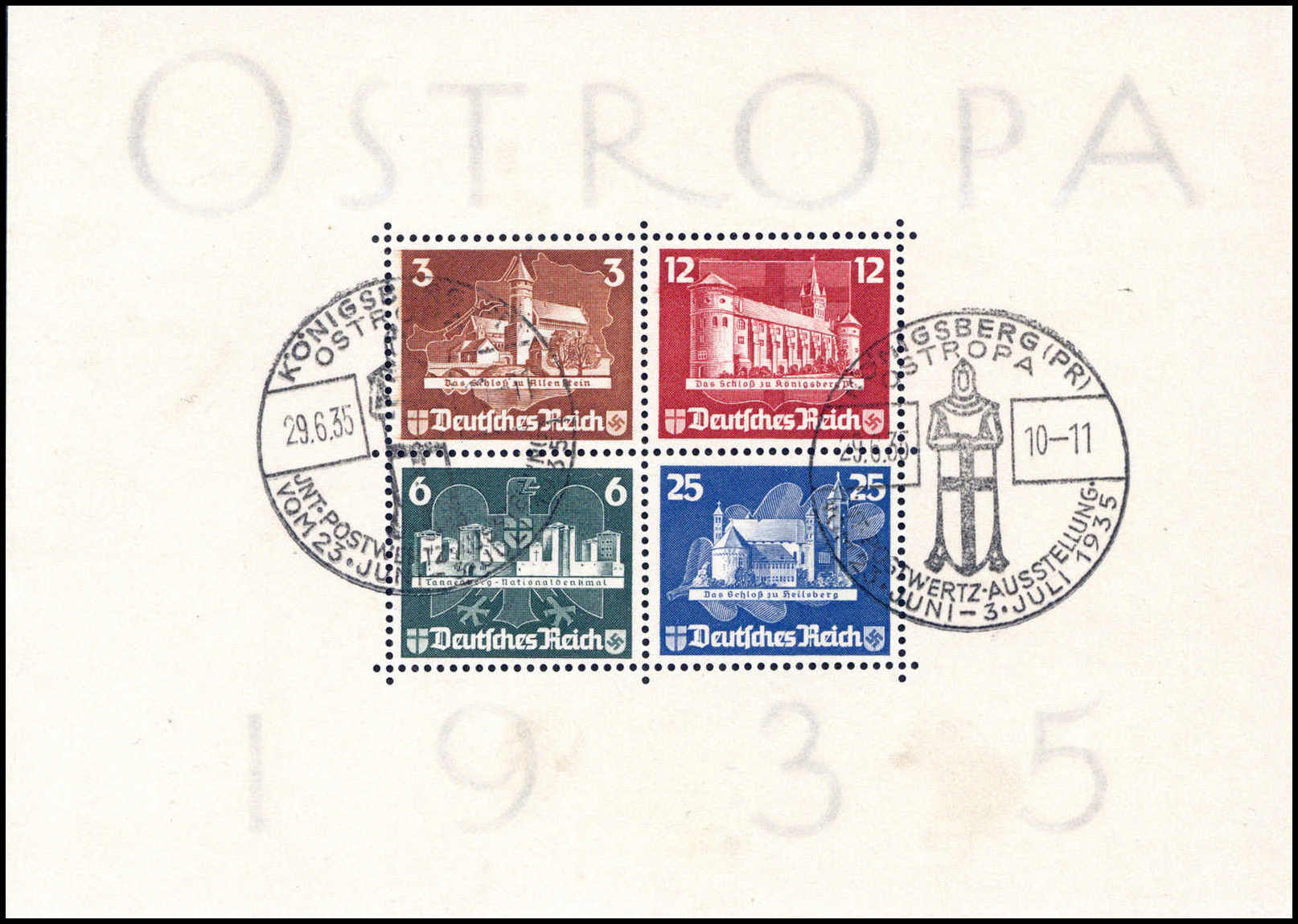 OSTROPA-Block, tadelloses Exemplar mit zwei sauber aufges. Ersttags-Ausstellungsstpln. KÖNIGSBERG 23/6 35. Katalogpreis: 1.100,-+