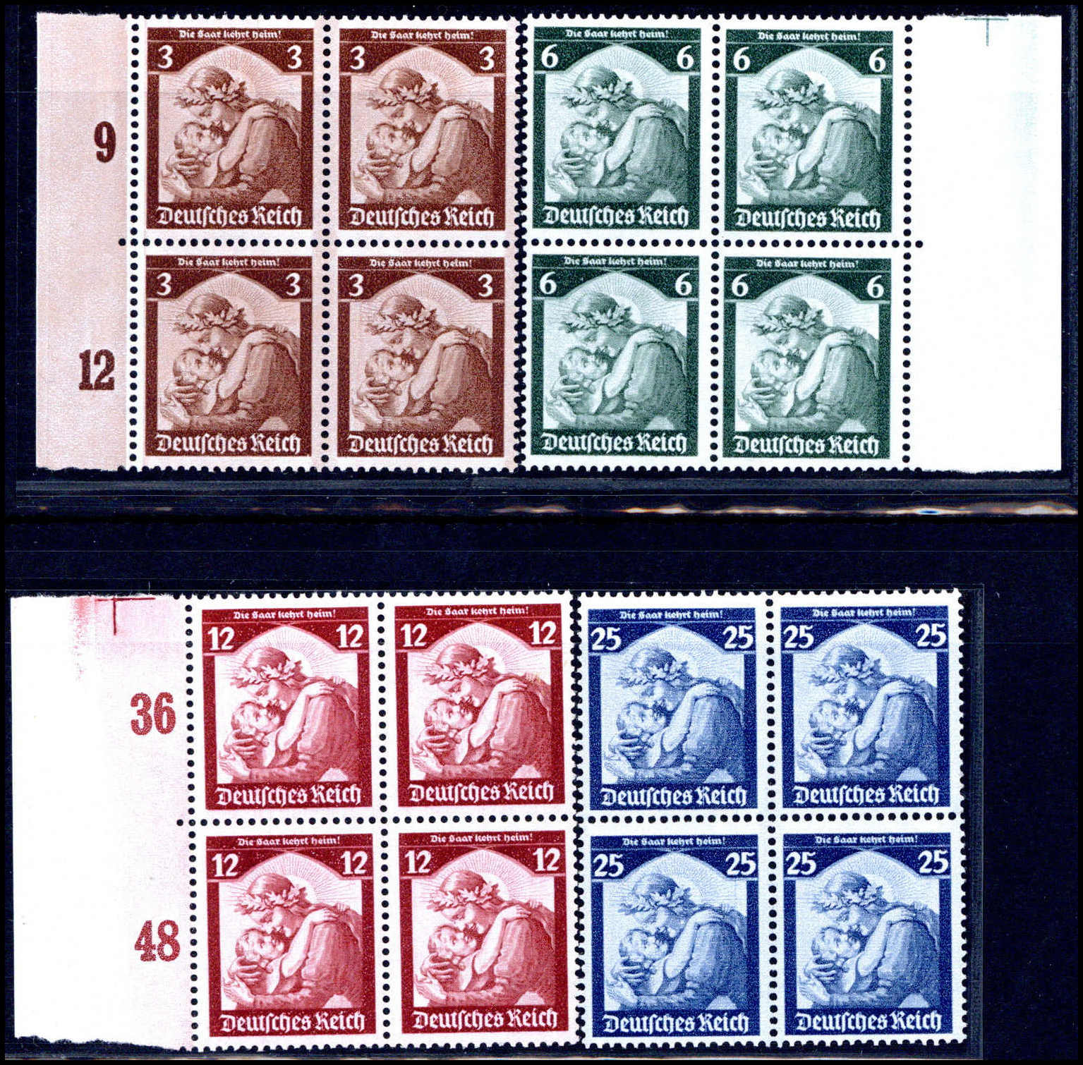 Saarabstimmung, 3 Pfg - 25 Pfg, vier Werte in tadellos postfrischen Vierrerblöcken. Katalogpreis: 480,-