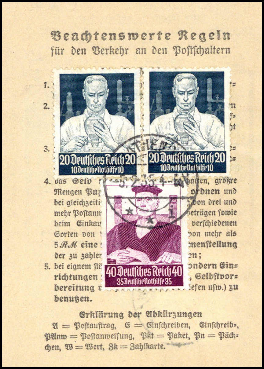 20 Pfg., zwei Exemplare mit 40 Pfg. und Stempel RATHENOW 5/2 35 auf kpl. Post-Einlieferungsschein, vs, zusätzl. frankiert mit 50 Pfg. Hindenburg