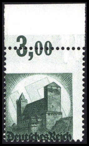 6 Pfg., Abart: stark verzähnt mit geteiltem Markenbild (Wertziffer oben statt unten), tadellos postfrisches Oberrandstück. Eine markante und seltene Abart
