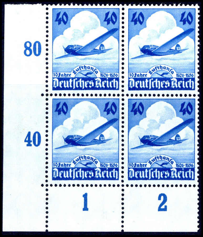 Lufthansa, tadellos postfrischer Vierrerblock aus der li. un. Bogenecke. Katalogpreis: 220,-