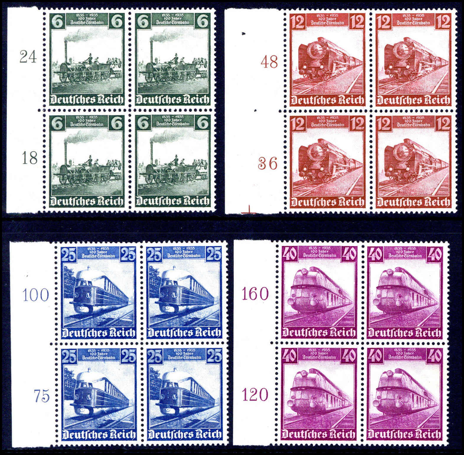 Eisenbahn, tadellos postfrische Vierrerblock-Serie einheitlich vom li. Bogenrand. Katalogpreis: 520,-+