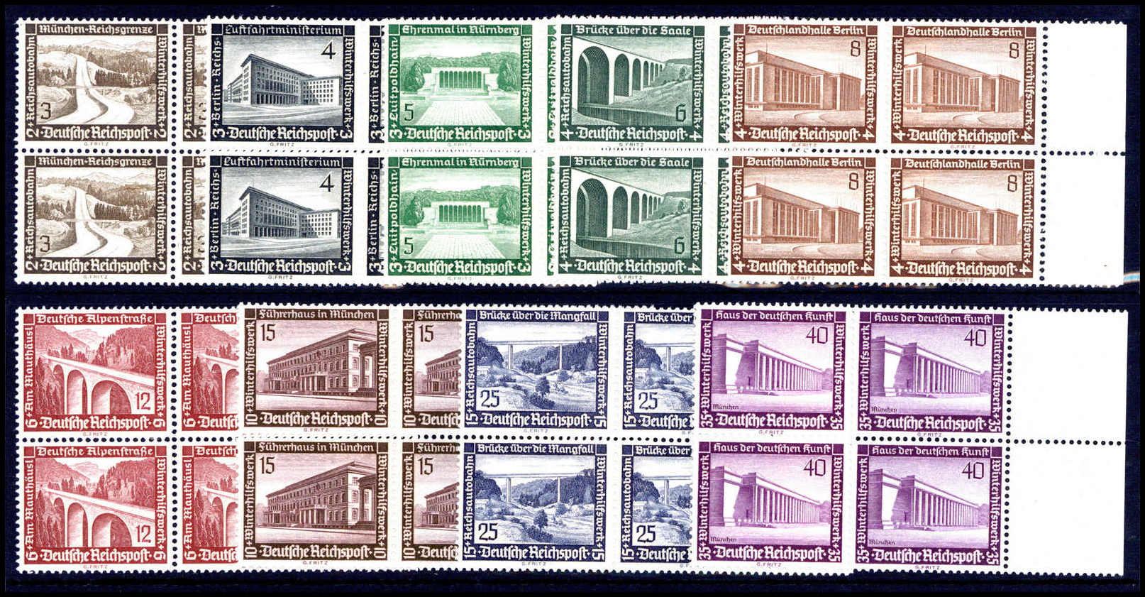 Winterhilfswerk, 3 - 40 Pfg, 9 Werte in tadellos postfrischen Vierrerblöcken einheitlich vom re. Bogenrand. Katalogpreis: 320,-