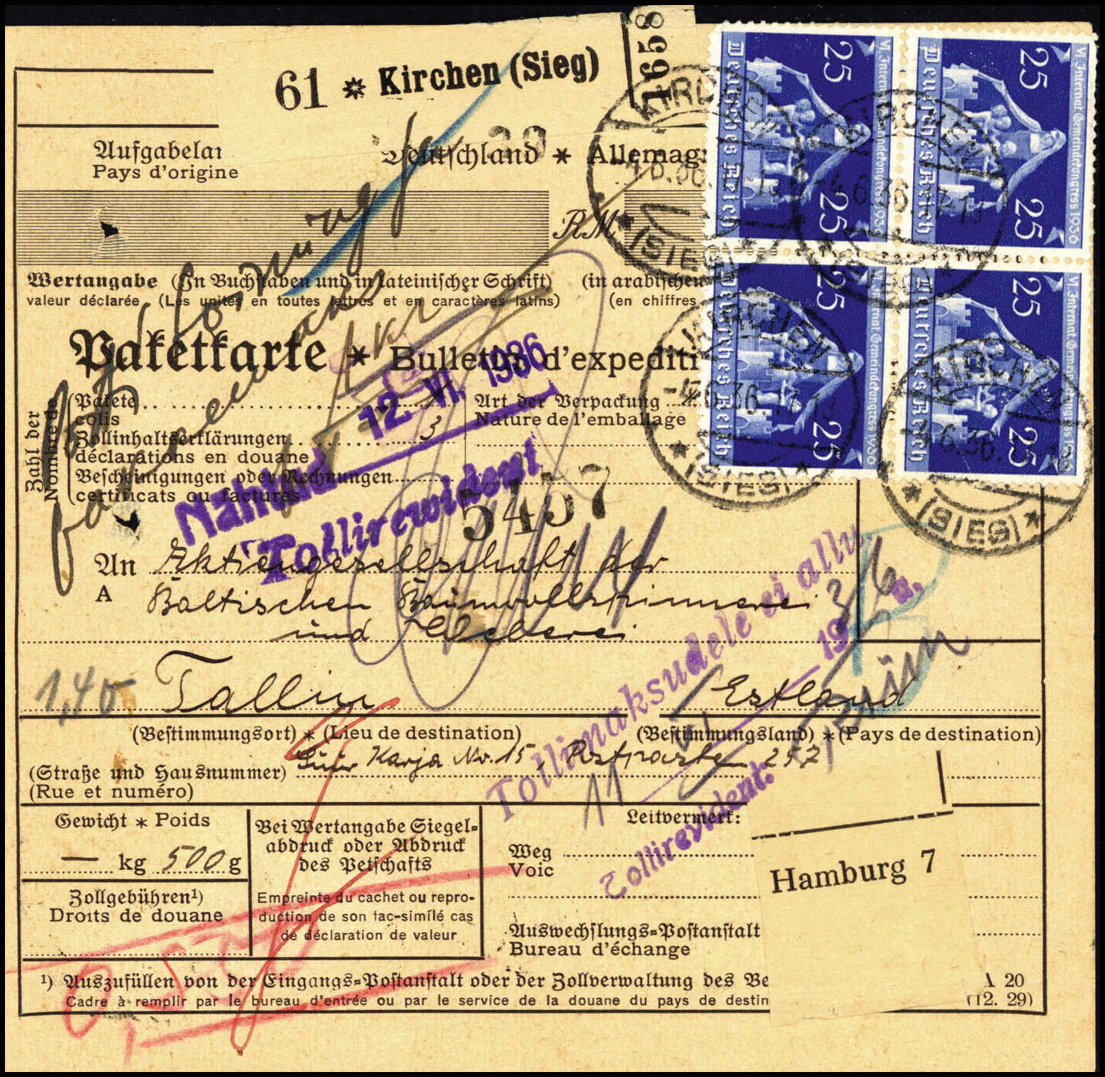 25 Pfg., Viererblock mit Hindenburg 15 Pfg. rs. auf Paketkarte mit Stempel KIRCHEN 4/6 36 nach Estland, rs. mit estnischen Marken nachfrankiert. Selten