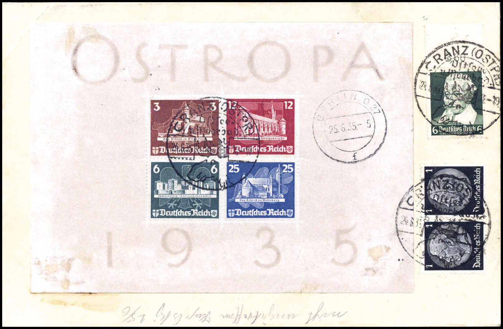OSTROPA-Block zusammen mit Schütz 6 Pfg. und Hindenburg 1 Pfg.(2) auf gelaufenem Einschreibebrief (übl. Gebrauchsspuren). Äußerst seltene Entwertung durch Stempel CRANZ (OSTPR. "Ostsee Moorbad 24/6 35"). Eine denkbar ungewöhnliche