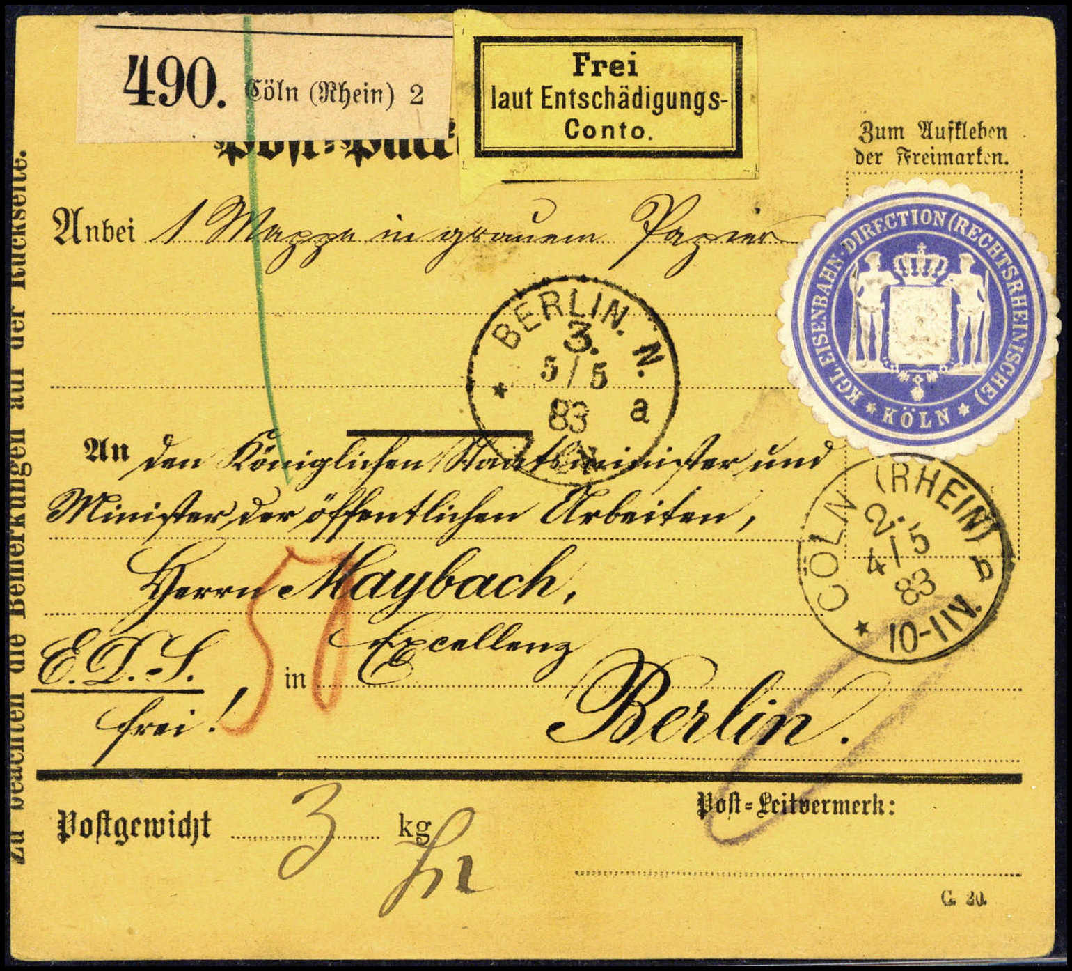 (RHEIN) "2 b" 4/5 83 nach Berlin mit vs. Ak.-Stempel. Praktisch alle bekannten Exemplare dieses Gebührenzettels befinden sich auf Dienstbriefen, in der hier gezeigten Form auf einer Paketkarte von größter Seltenheit, Fotoattest Jäschke-L.BPP ("Mir