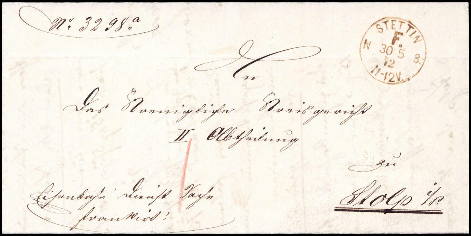 1872, Eisenbahn-Dienstsache mit rotem Franko-K1 STETTIN nach Stolp, Fotoattest Brugger BPP
