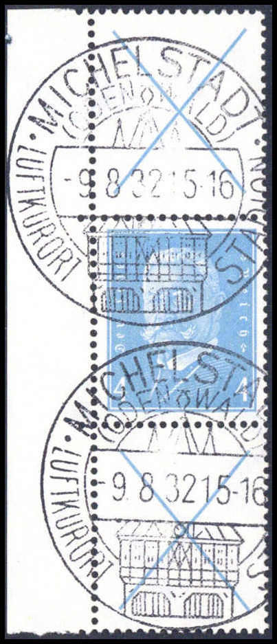 Hindenburg X/4/X mit linken Bogenrand, sauber entwertet mit Ortswerbestempel "MICHELSTADT 9.8.32" Katalogpreis: 200