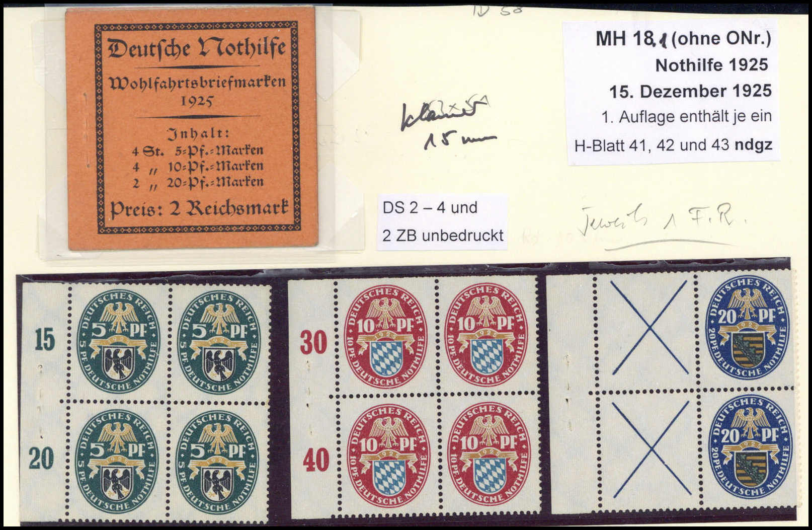 Nothilfe 1925, alle vier Auflagen des Markenheftchens 18 inkl der sehr seltenen MH 18.3 und 18.4, jeweils zerlegt mit allen Deckeln (ohne Klammern), Zwischenblättern (nicht bei 18.4) und H.Blättern 41-45 in versch. Varianten; die H-Bl.