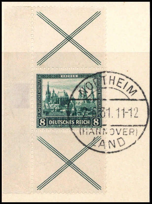 Nothilfe X/8/X übergehend entwertet "NORTHEIM 2.6.31" auf Briefstück. Katalogpreis: 600,-
