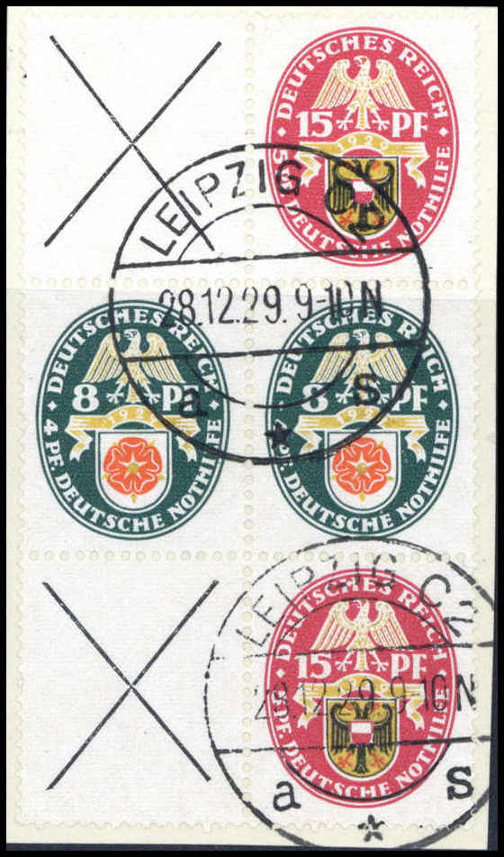 Nothilfe X/8/X zusammenhängend mit Nothilfe 15/8/15 auf kl. Briefstück, entwertet "LEIPZIG C2 28.12.29" Katalogpreis: 500,-