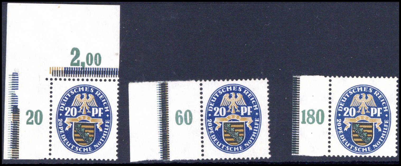 Nothilfe 20 Pfg. in der helllen Farbe, drei ZD W20.3 mit Summenzähler "20" und oberem Reihenwertzähler "2,00", sowie Summenzähler "60" und "180", tadellos postfrisch. Katalogpreis: 2200,-++