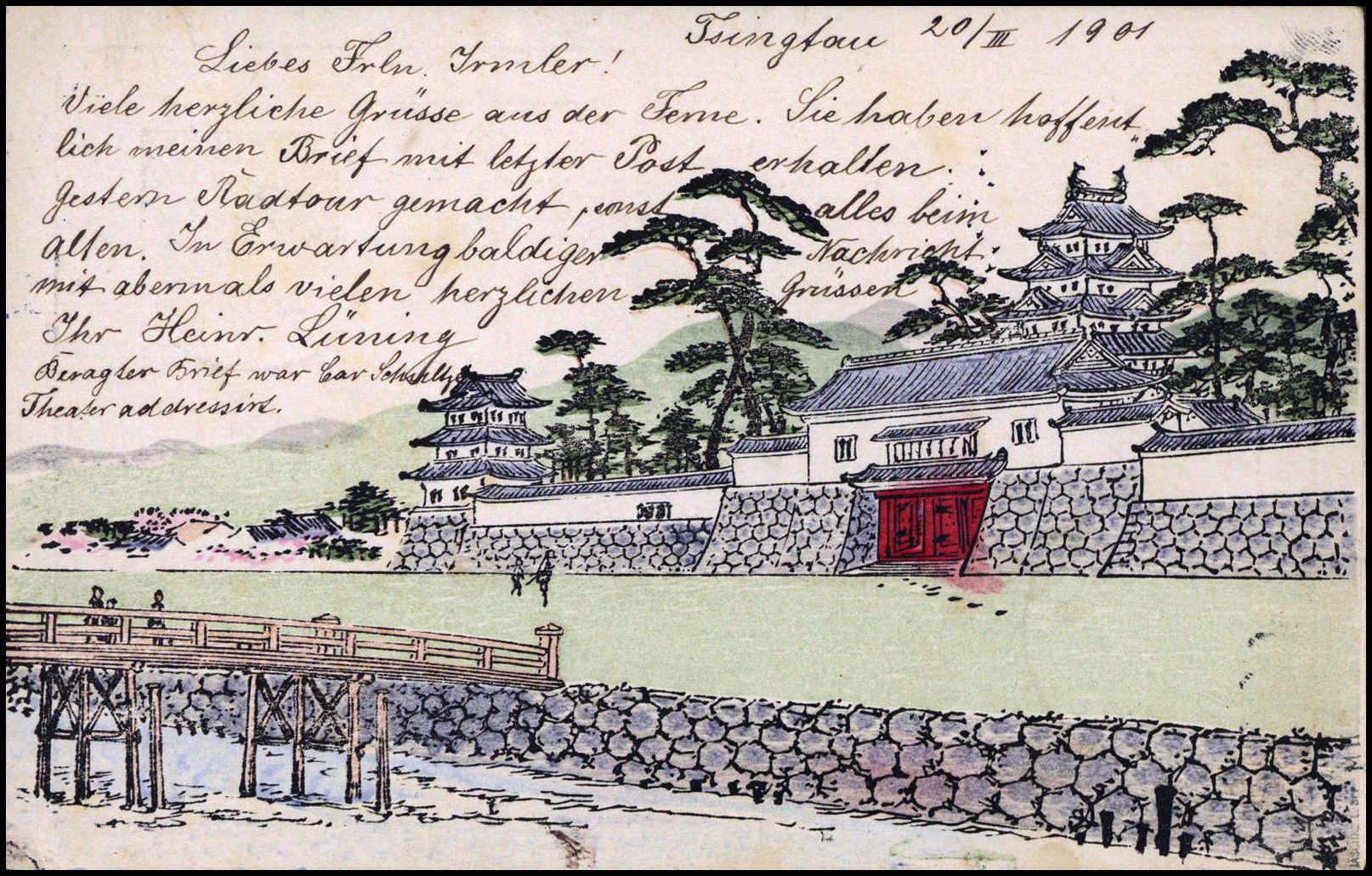 TSINGTAU 20/3 01, auf Vorläufer-Postkarte 5 Pfg., rs. dekorative, kolorierte Tuschfederzeichnung