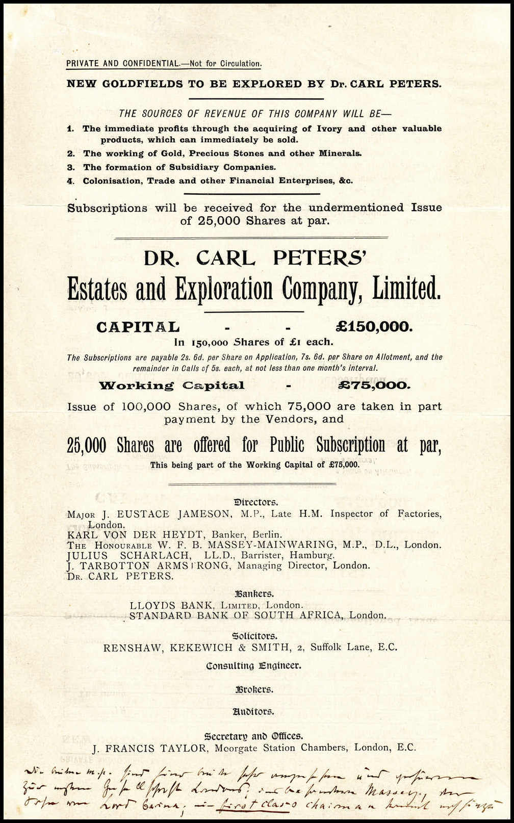Gold-Schürfungs-Gesellschaft, unten mit eigenhänd. Zusatz von Dr. Peters sowie dessen hs. Absender-Vermerk auf der Rückseite des Umschlags. Ein interessantes Los