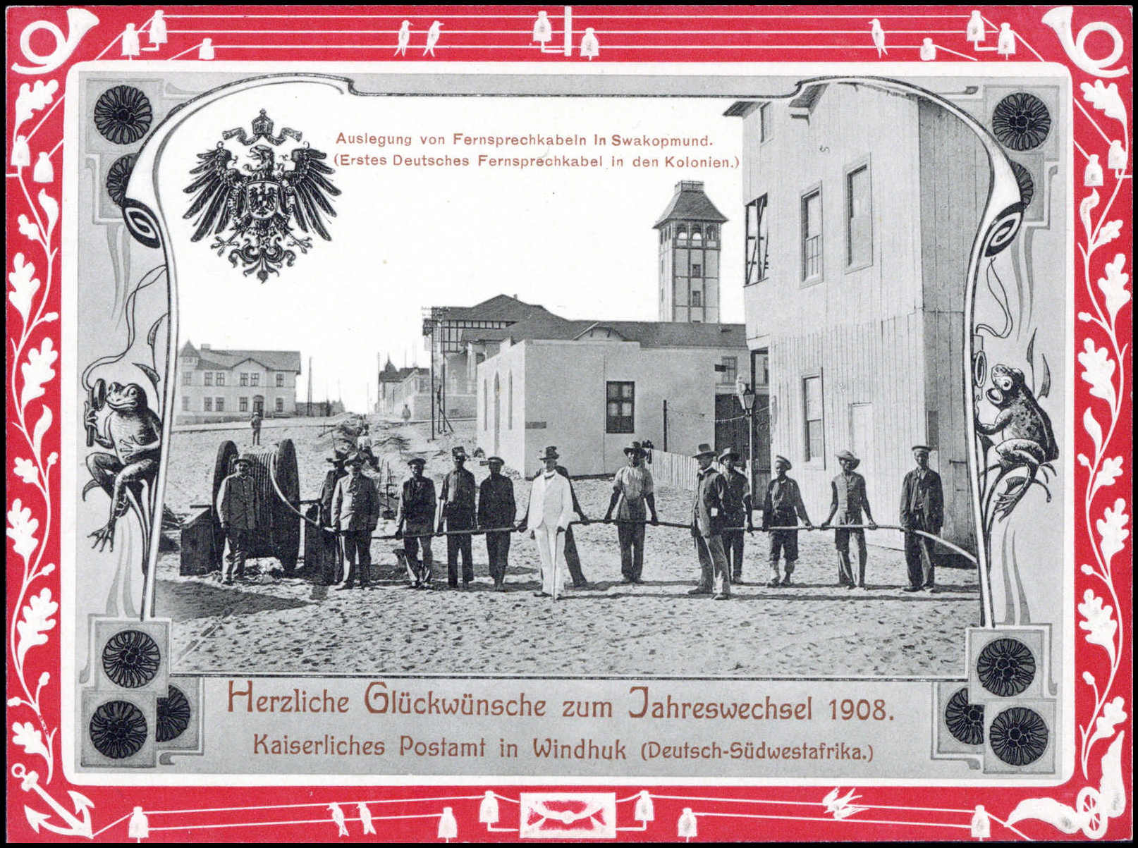 1908, Neujahrs-Glückwunschkarte des Postamts Windhuk mit Foto "Auslegung von Fernsprechkabeln in Swakopmund"