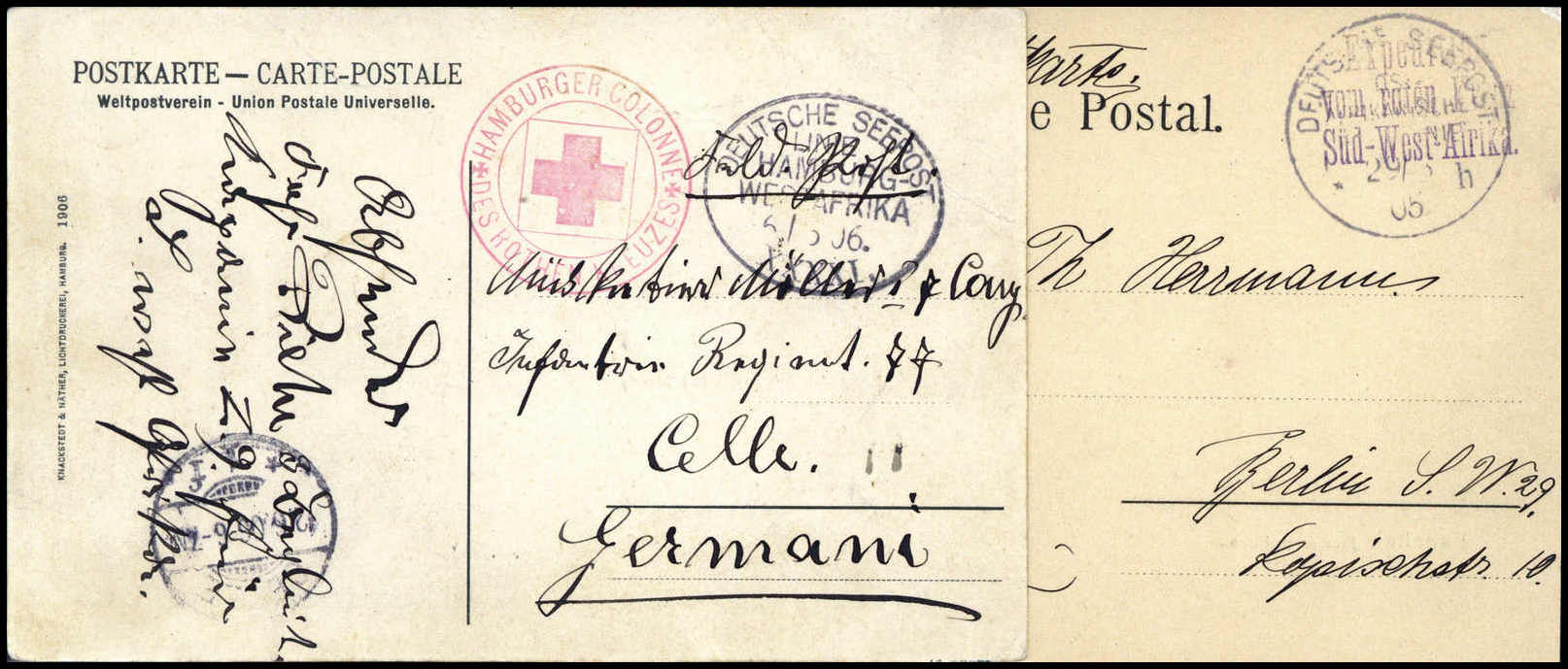 1905/08, Rotes Kreuz, drei seltene Feldpostkarten mit verschied. Rotes-Kreuz-Nebenstempeln, dazu eine Postkarte mit violettem Gummistempel "Liebesgaben-Depot Windhuk". Teils kl. Mängel