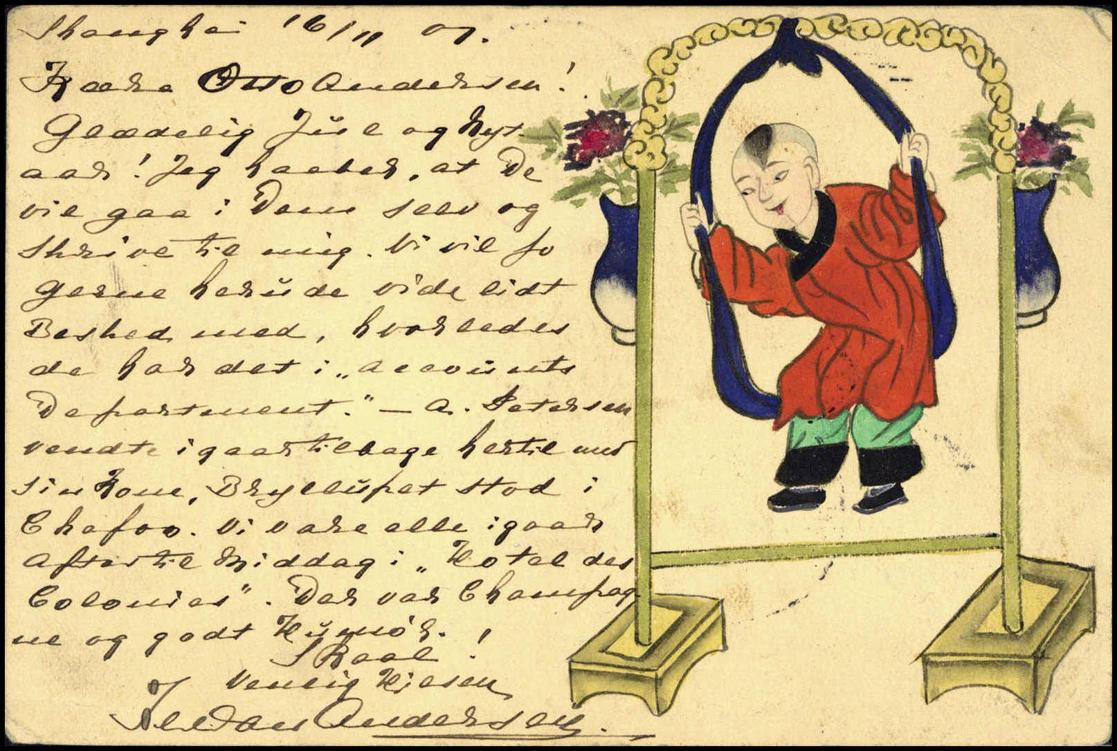 1901, Ganzsachenkarte China 1 C. mit Zusatzfrankatur 10 Pfg., bedarfsmäßig nach Kopenhagen, rs. dekorative kolorierte Tuschfederzeichnung