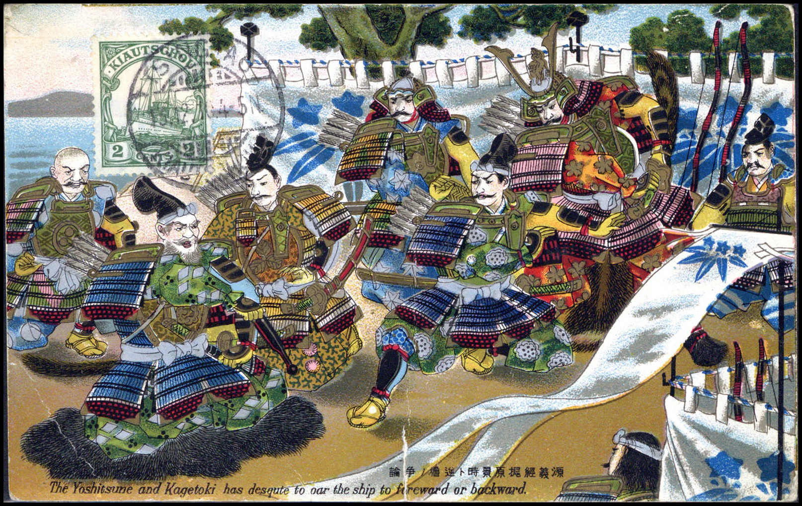 1910, patriotische japanische Litho-Postkarte, bildseitig frankiert mit 2 C. und Stempel TSINGTAU 13/12 10 (kl. Mgl.)