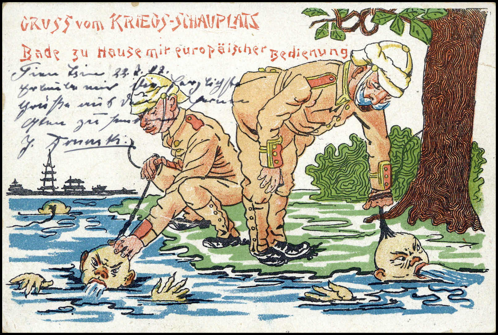 1902, seltene, farbige Spott-Ansichtskarte "Gruß vom Kriegs-Schauplatz - Bade zuhause mit europäischer Bedienung"