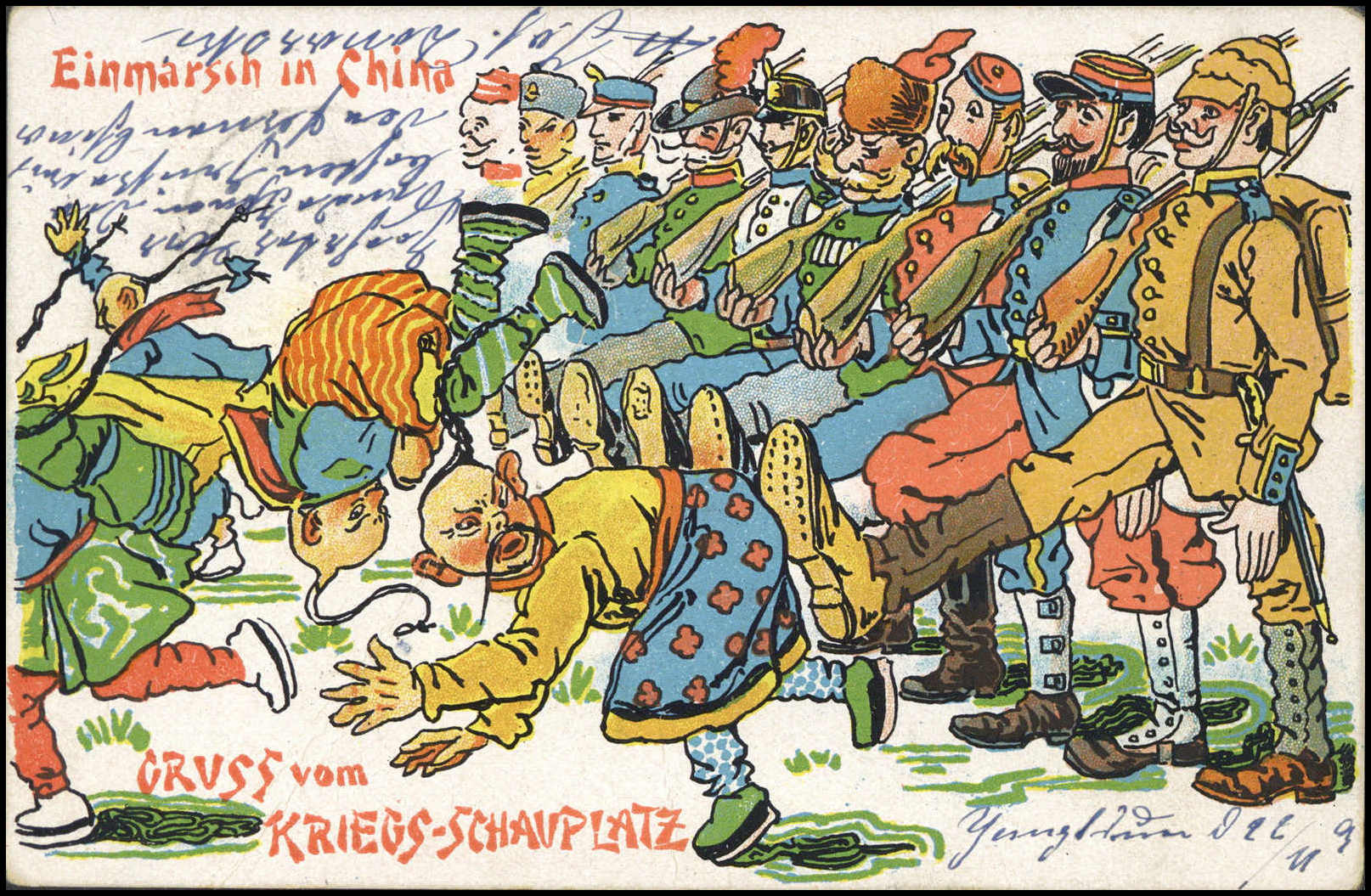 1901, farbige Spott-Ansichtskarte "Einmarsch in China"