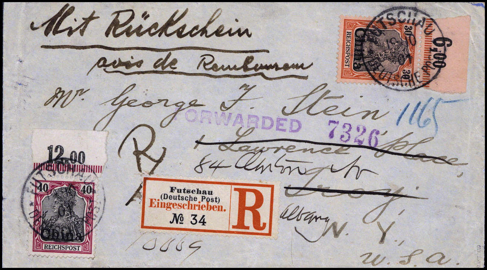 Einschreiben mit Rückschein: 10 Pfg. rs. sowie 30 und 40 Pfg. vs. auf seltenem Auslands-Einschreibebrief in die USA, oben Vermerk "mit Rückschein", klare Stempel FUTSCHAU 19/10 01. Selten