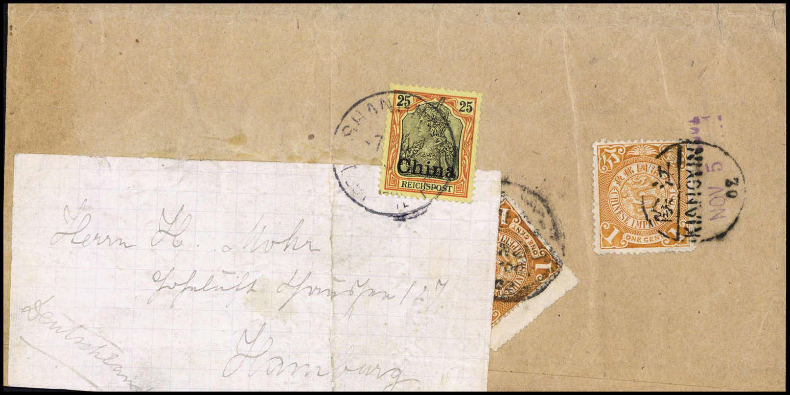 25 Pfg. auf gef. Drucksachen-Streifband (unten leicht verkürzt) mit Stempel SHANGHAI 7/11 02, vorfrankiert mit zweimal China 1 C., eine mit seltenem Stempel KIANGYIN 5/11 02 (separater Tages- und Monatsstempel). Eine interessante und
