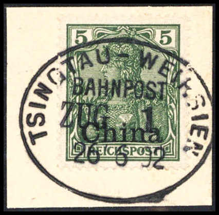 5 Pfg., tadelloses Bfstk. mit ideal aufges. Stempel TSINGTAU-WEIHSIEN BAHNPOST ZUG 1 26/6 02