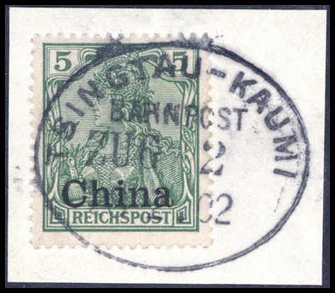 5 Pfg., tadelloses Bfstk. mit seltener Entwertung durch idealen Stempel TSINGTAU-KAUMI BAHNPOST ZUG 2 28/2 02