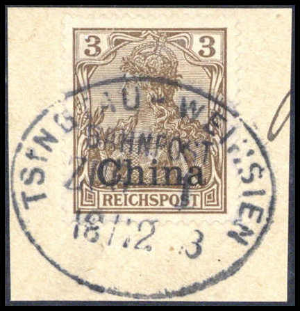 3 Pfg., tadelloses Bfstk. mit vollem Stempel TSINGTAU-WEIHSIEN BAHNPOST ZUG 1 18/12 03