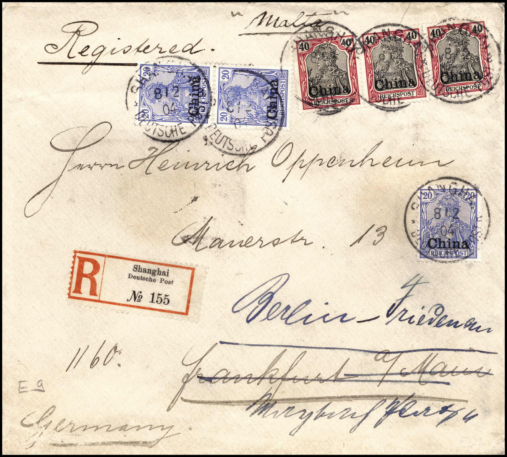 20 Pfg., senkr. Paar und Einzelstück mit waagr. Dreierstreifen 40 Pfg. auf seltenem Einschreibebrief in der 8. Gewichtsstufe nach Dtld. (leichte Beförd.-Spuren), Stempel SHANGHAI 8/12 04 und Schiffsvermerk "Malta"