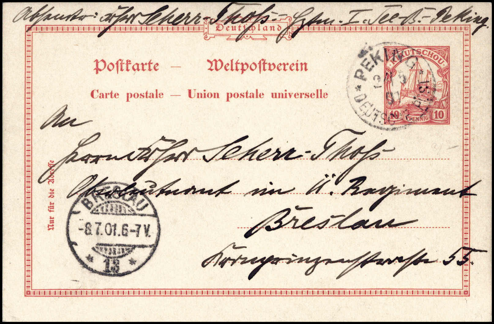 Ganzsachenkarte Kiautschou 10 Pfg. in Petschilli-Verwendung mit klarem Stempel PEKING 24/5 01 nach Breslau mit Eingangsstempel. Einwandfreies Bedarfsstück dieser so extrem seltenen Ganzsachenkarte. bei Mi. nur mit "-,-" aufgeführt
