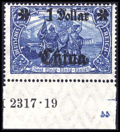 1 $, tadellos postfrisches Unterrandstück mit voller Aufdruck-HAN "H 2317.19". Eine der seltenensten HAN bei der D.P.China, bei Mi. lediglich ungebraucht mit 1.400,- notiert, in postfrischer Erhaltung mangels fehlendem Vorkommens in den