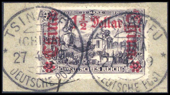 1½ $, tadelloses Bfstk. mit zwei klaren Stempeln TSINANFU 27/4 09, sign. Steuer BPP. Katalogpreis: 150,-+