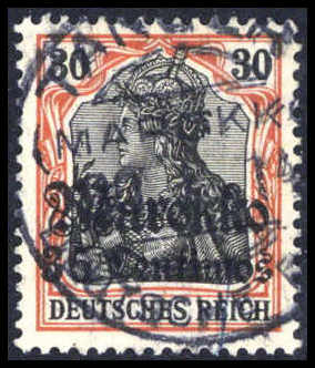 35 C., a. orangeweiß, tadelloses, besonders farbfrisches Exemplar mit klarem Stempel TANGER MAROKKO 30/1 14. Eine seltene Marke mit dieser zeitgerechten, regulären Abstempelung, Fotoattest Steuer BPP. Katalogpreis: 1.800,-