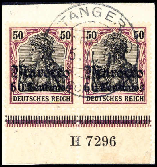 60 C., tadelloses, waagr. Unterrandpaar auf Bfstk. mit Aufdruck-HAN "H7296", idealer Stempel TANGER MAROKKO 15/11 11. Gestempelte HAN-Paare sind nur wenige bekannt geworden, Fotoattest Steuer BPP
