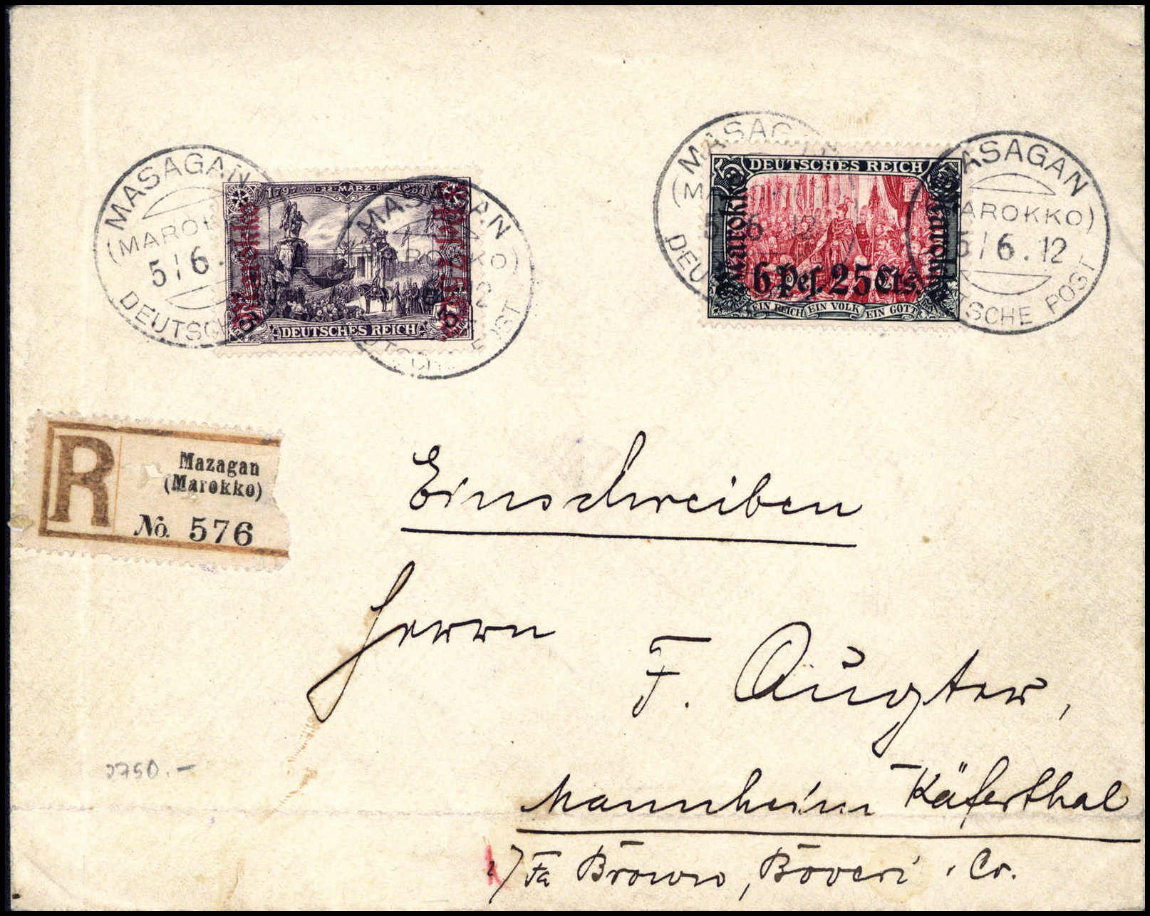 3,75 und 6,25 Pes., tadellose Exemplare mit klaren Stempeln MASAGAN 5/6 12 auf gef. R-Brief nach Mannheim. Katalogpreis: 1.010,-