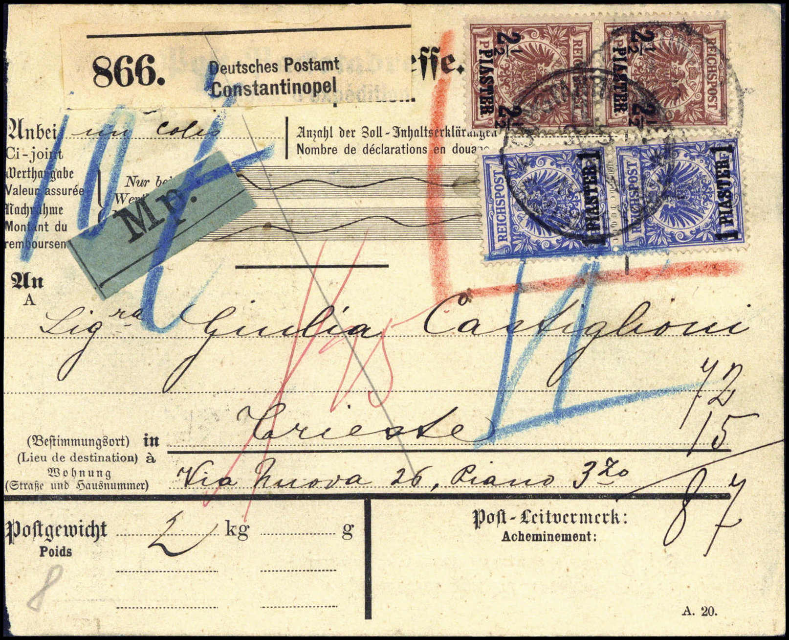 1 und 2½ Pia., je im tadellosen senkr. Paar mit Stempel CONSTANTINOPEL 1. 27/5 99 auf frisch erhaltener Paketkarte nach Triest, rs. Durchgangsstpl. von Konstanta und Orsova