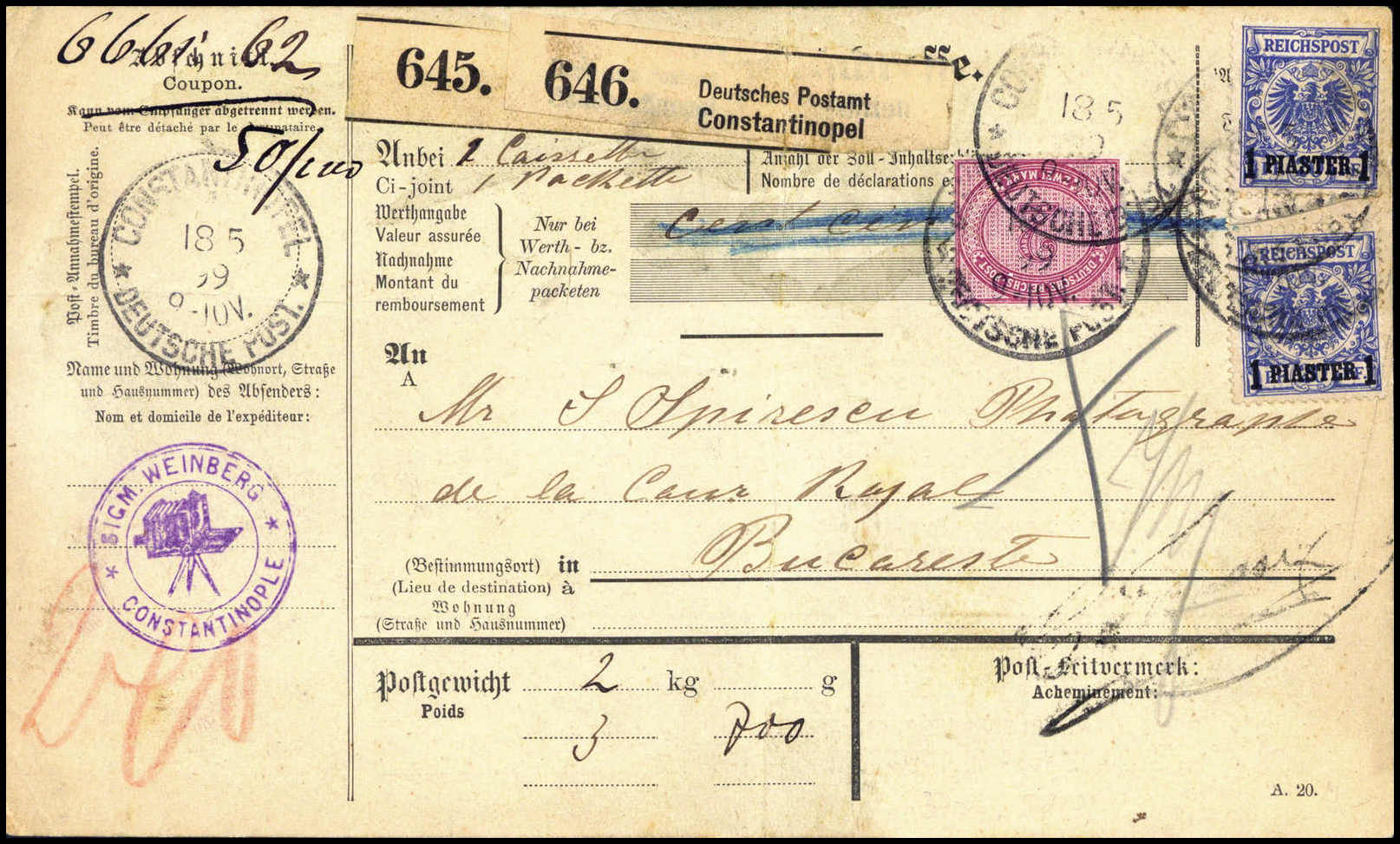1 Pia., senkr. Zwischenstegpaar (im Steg Aufklebequetschung) mit Vorläufer 2 Mk. auf kpl. Paketkarte nach Bukarest (Beförd.-Spuren), Stempel CONSTANTINOPEL 1. 18/5 99. Rs. rumänische Steuermarke über 10 B. Eine seltene Karte