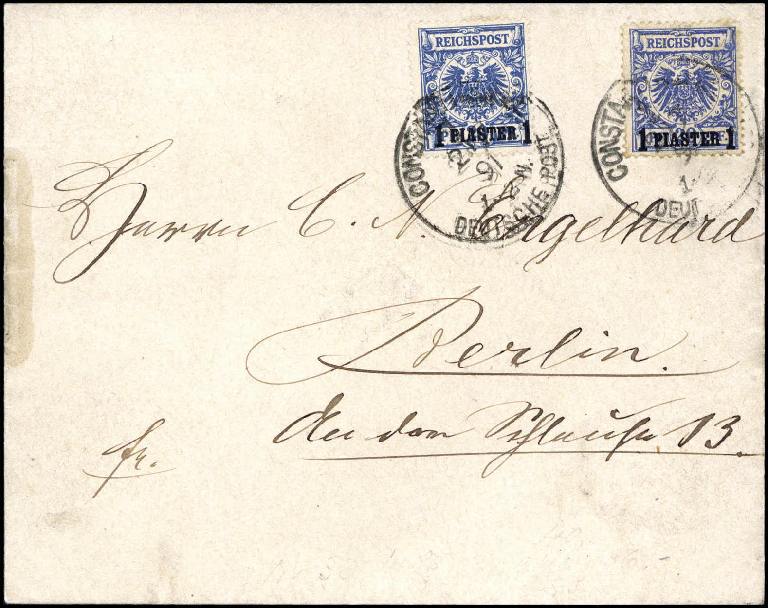 1 Pia. mittelultramarin und mittelblau, tadellose Exemplare zusammen verwendet auf Brief mit Stempel CONSTANTINOPEL 21/7 91. Eine seltene Frankatur, Fotobefund Wiegand BPP