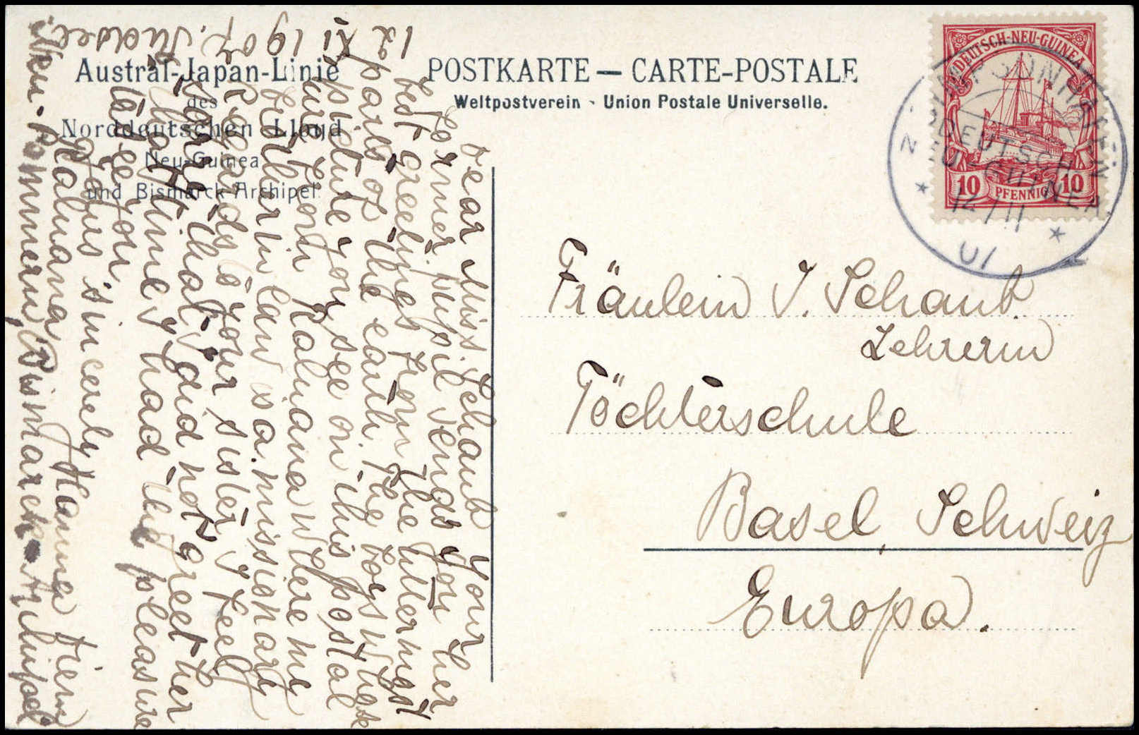 10 Pfg., tadellose Bedarfs-AK ("Männer und Knaben der Gazelle-Halbinsel") mit klarem Stempel SIMPSONHAFEN 14/11 o7 nach Basel