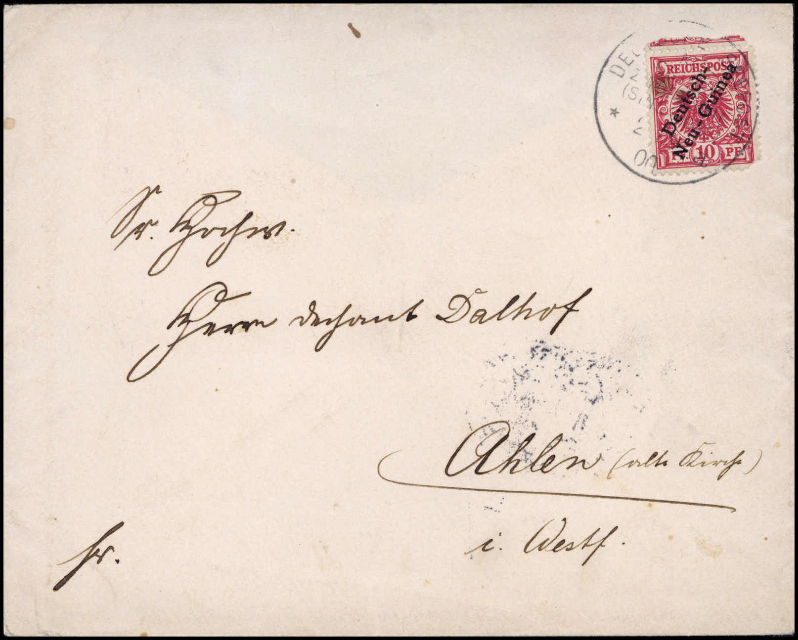 NEU-GUINEA-ZWEIGLINIE (SINGAPORE) "a" 2./9 00 auf Bedarfsbrief 10 Pfg. (rs. ohne die Oberklappe und Marke Aufklebefehler) nach Deutschland