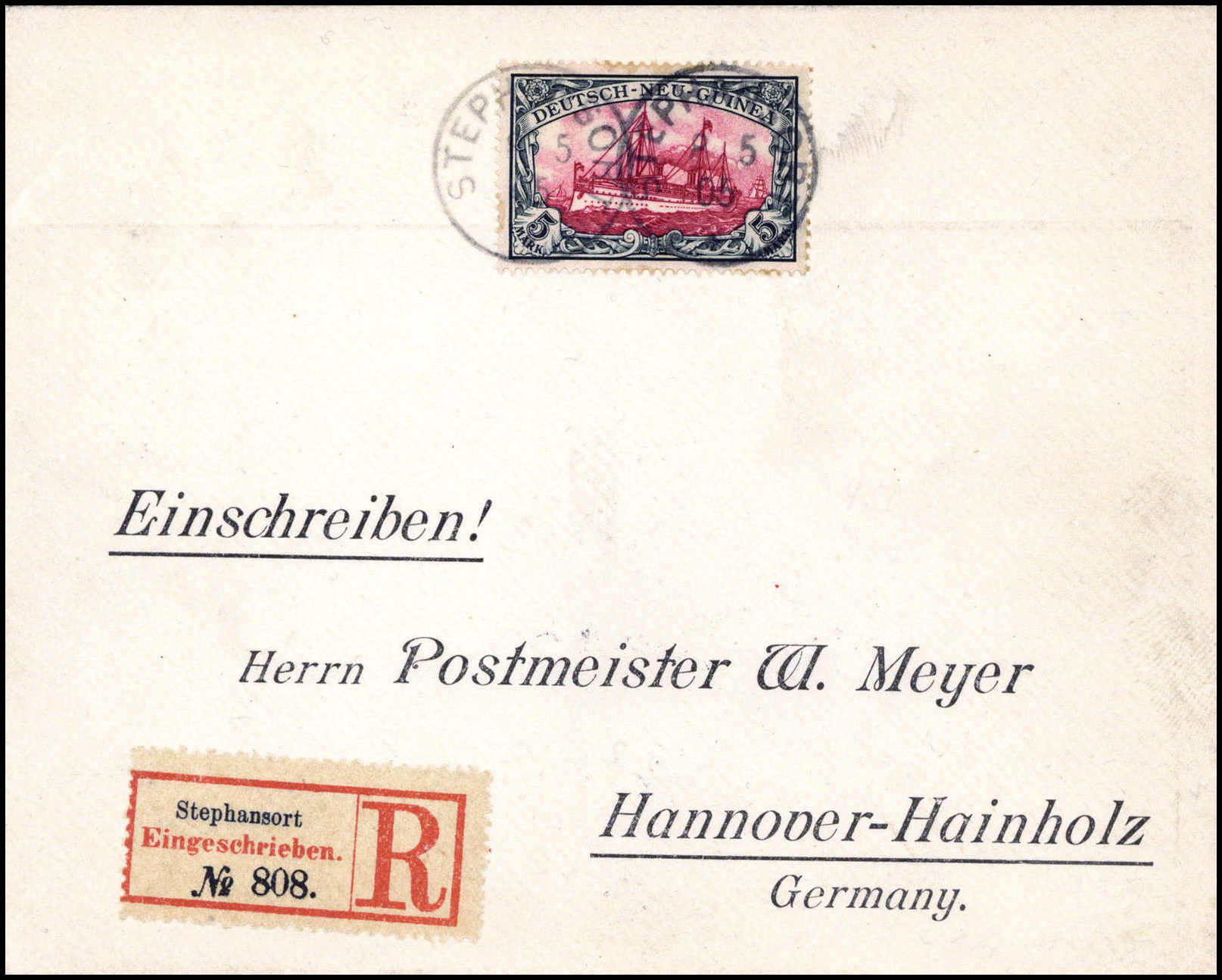 5 Mk., tadellose EF mit zwei klaren Stempeln STEPHANSORT 8/5 05 auf philat. Vordruck-Einschreibebrief nach Hannover mit Ak.-Stempel, Fotoattest Jäschke-L.BPP. Katalogpreis: 900,-