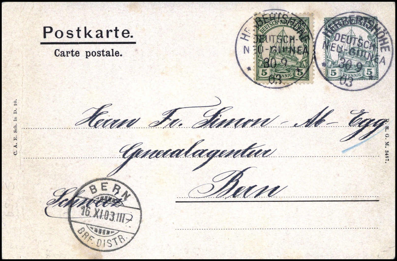 Richard Parkinson 5 Pfg., Zusatzfrankatur auf Privat-Ganzsachenkarte 5 Pfg. mit ideal aufges. Stempel HERBERTSHÖHE 30/9 03 nach Bern mit Eingangsstempel. Rs. mit hs. Abs.-Vermerk "R. Parkinson, Bismarck-Arch. 28/9 03". Von dem berühmten