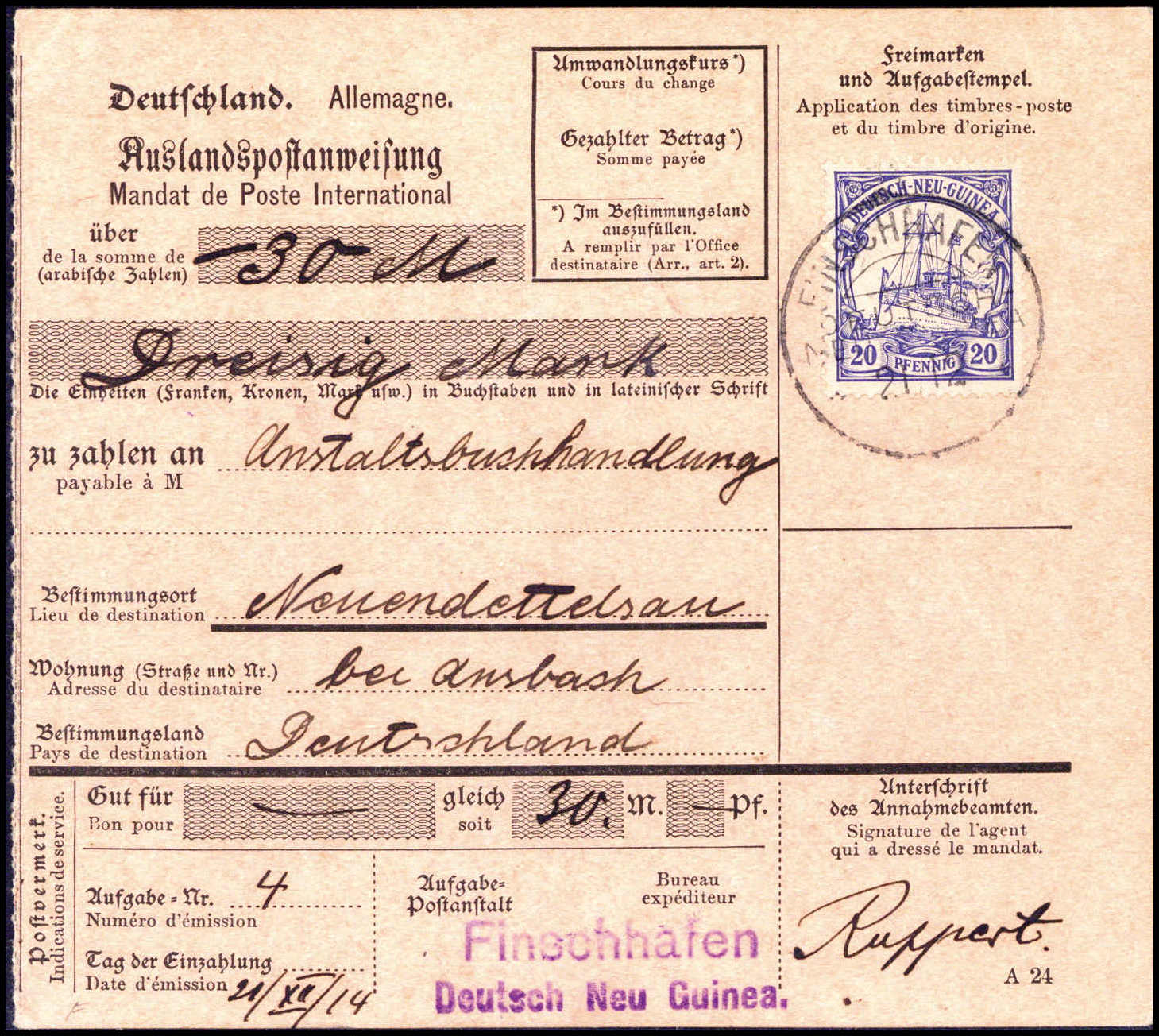 Frankierte Postanweisung: 20 Pfg., tadelloses Exemplar mit klarem Stempel FINSCHHAFEN 29/12 (14) auf lachsfarbener Auslands-Postanweisung über 30 Mark an die Neuendettelsauer-Mission. Unten mit violettem Innendienst-L2 FINSCHHAFEN DNG.